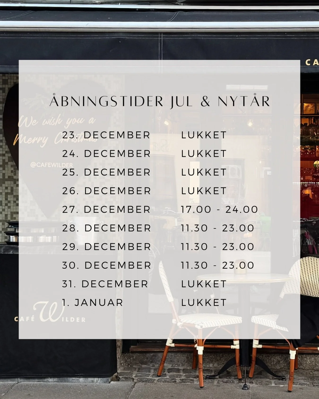 Café Wilder er indfødt christianshavner med Paris i ascendanten. Lille, hyggelig og hjertevarm med stemning i alle hjørner og plads til alle. Maden er fransk bistrokøkken tilsat en god håndfuld dansk snusfornuft: Enkelt, lækkert og til fornuftige priser. Wilder er en uformel restaurant, hvor snakken går, og man får lyst til at hænge over en ekstra pastis i baren eller under varmelamperne udenfor.